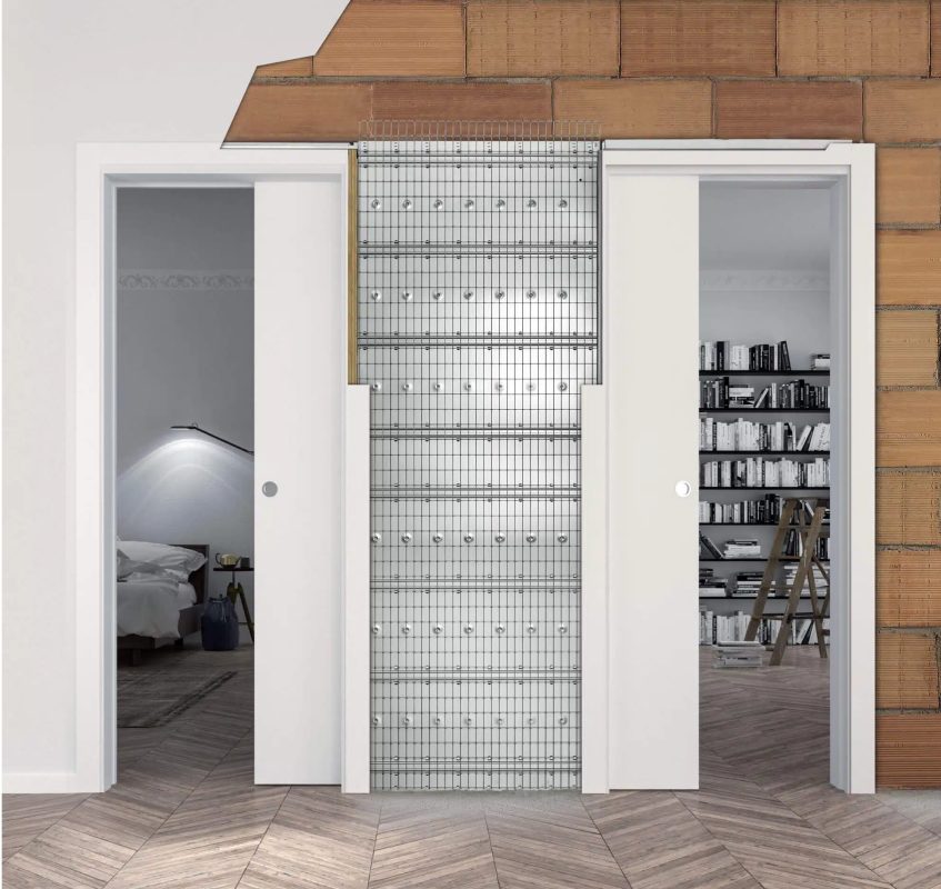 ECLISSE CLASSIC ZÁKRYT do zdiva je stavební pouzdro pro dvoje posuvné dveře zasouvané do jedné stěny uprostřed.